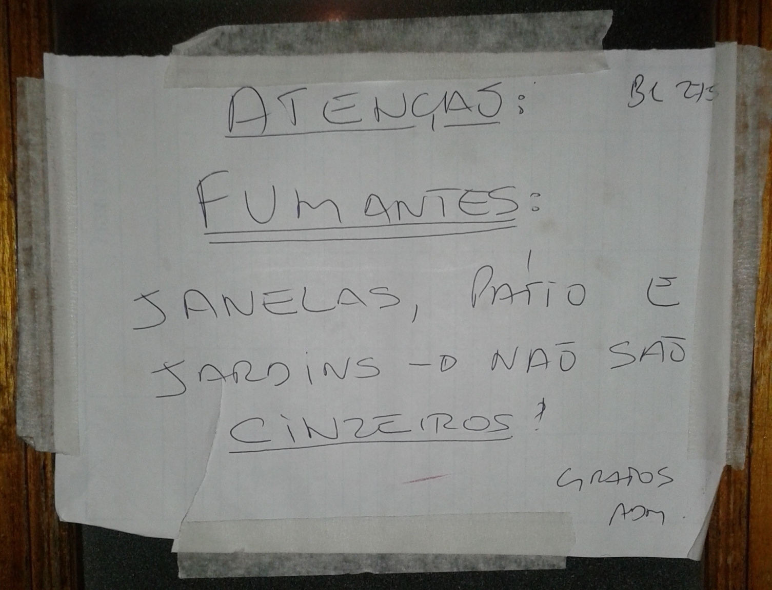 O cartazinho ainda ofende (não só com o sarcasmo, mas com todos os problemas listados aqui) todos os não fumantes que, para entrar em casa, inevitavelmente têm de passar por ele. Também envergonha todos os moradores, porque as visitas deles, ao entrarem no prédio, também acabam lendo esse cartazinho tosco. Eu, se fosse meu visitante, não teria dúvidas: “é, o Guri mora num cortiço.”