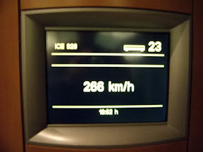 Claro que eu não podia terminar o post sem fazer menção ao meu meio de transporte mais usado (e preferido): InterCity Express (ICE) o trem de alta velocidade (até 300 km/h) da Deutsche Bahn, rede ferroviária alemã. Na volta de Düsseldorf, pouco depois que a tela do trem chegou a marcar 274 km/h, registrei na foto: