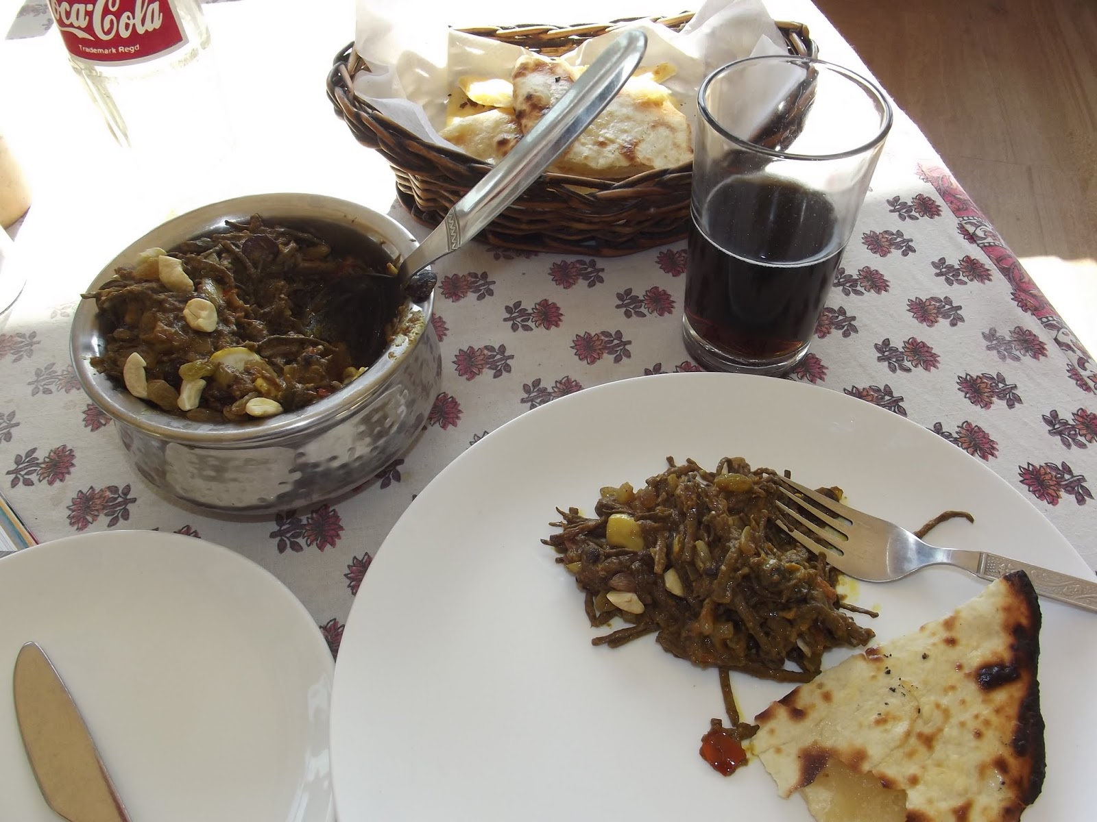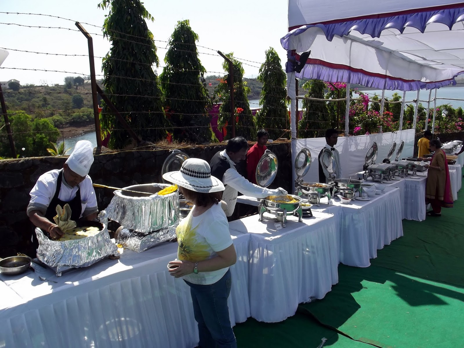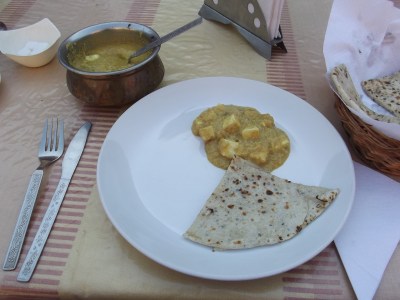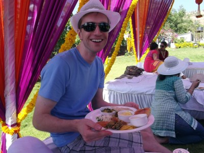 O café-da-manhã que nos esperava na chegada era um verdadeiro banquete. Numa das extremidades da tenda branca, um buffet vegetariano; na outra, um não vegetariano. Eu me senti bem em casa no lado vegetariano, graças à ajuda do amigo indiano Atul, colega da NYU e vegetariano como eu, que me deu todas as dicas de que eu precisava quanto aos pratos indianos. Infelizmente não tive como memorizar todos os nomes, mas o certo é que eu provei de tudo que o Atul me recomendava. Mal tinha terminado o farto café-da-manhã, foi servido um almoço mais completo ainda.